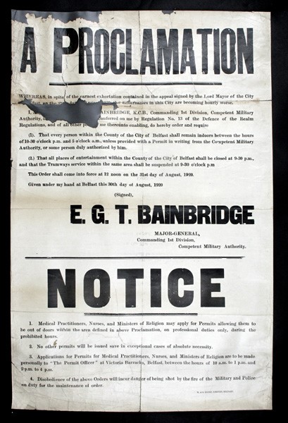 Belfast was placed under a military curfew from 31st August 1920 onwards: all people had to remain indoors between 10:30pm – 5:00am. During the Pogrom, six people were shot and killed by British military or by police for failing to halt when spotted on the streets after curfew.