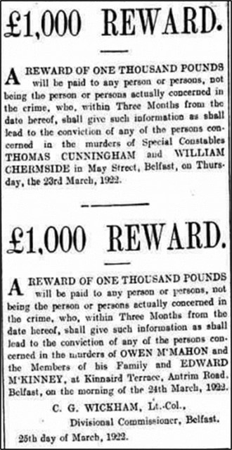 Equal rewards offered by the RIC for help convicting the killers of the two Specials and the McMahon family
