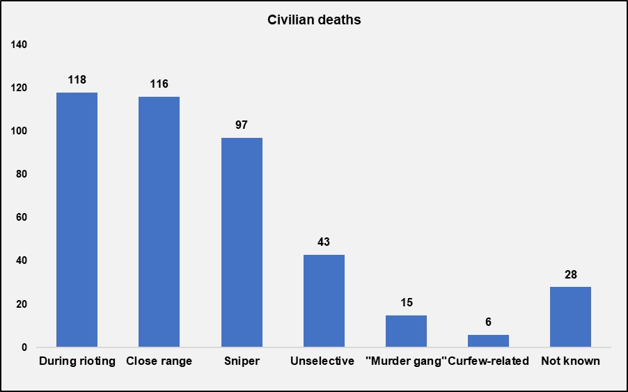 As can be seen from the graph above, killings during rioting were – by a tiny margin – the most numerous type of fatality suffered by civilians.