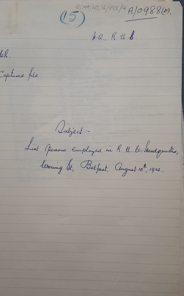 Cover sheet of “List of persons employed in RUC Headquarters, Waring St, August 10th, 1922” IE/MA/HS/A/0988/15 (image used with kind permission of Military Archives)
