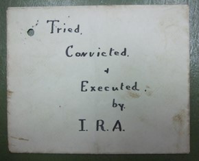 “The document, which was headed Oglaig [sic] na h’Eireann, read: ‘I wish to inform you that we will take immediate action against you regarding accepting money from Crown forces, also to being seen giving information to the Crown forces by being seen in the company of Specials, and showing good feeling towards the enemy. We can prove by witnesses that saw you doing so. We now hope that this is sufficient warning, otherwise drastic measures will have to adopted.’”47