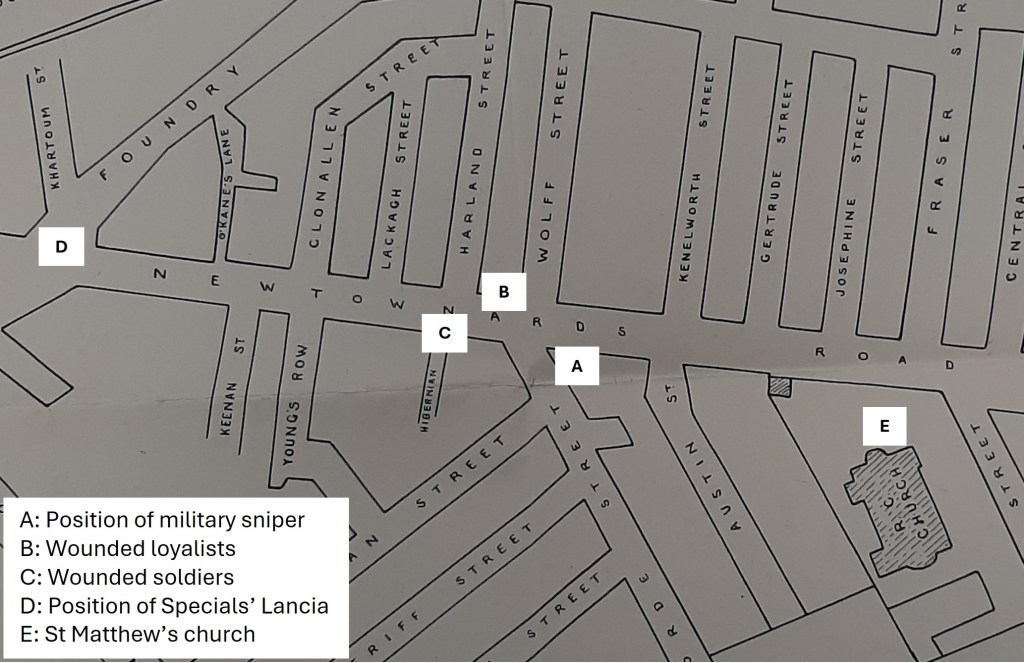 Meanwhile, a Specials Lancia armoured car which had been stationed at the bottom of Foundry St also drove up. Believing the sniper’s shots to have been fired by nationalists, they followed what was evidently their normal practice and raked Seaforde St with machinegun fire. They then reversed back along the Newtownards Road, passing within twenty yards of the wounded soldiers, who they assumed were being aided by friendly and anxious unionists rather than being attacked by hostile and angry loyalists. They said they thought the soldiers were wounded by shots from the nationalist O’Kane’s Lane, so they also machinegunned that street for good measure.33