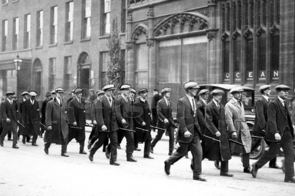 Shipyard workers on a march organised by UESA and the British Empire Union to prevent a Belfast Labour Party election meeting from going ahead