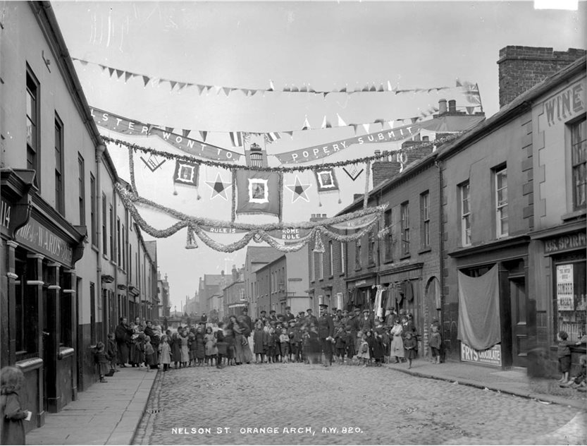 An Orange arch in Nelson Street, where Imperial Guards intimidated Josehine Moan and her children from their home, then burned it (© National Museums Northern Ireland)