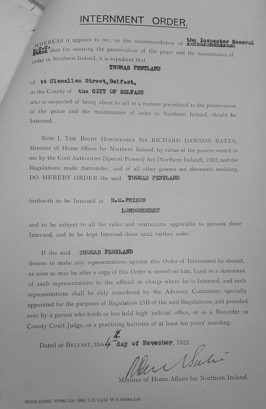 Internment order of Thomas Pentland (© PRONI, Pentland, Thomas, Clonallen St, Belfast, HA/5/2221; image reproduced by kind permission of the Deputy Keeper of Records, PRONI)