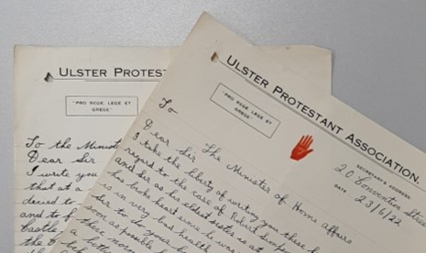 24 Jane Simpson to Minister of Home Affairs, 3 May 1922 & A.P. Magill minute, 7 June 1922, PRONI, Internment of Robert Simpson, Beersbridge Road, Belfast, HA/5/962B.