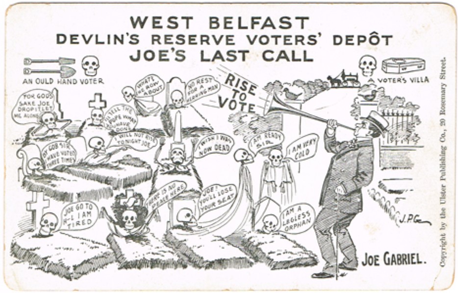 A satirical unionist postcard commenting on Joe Devlin’s ability to get the vote out