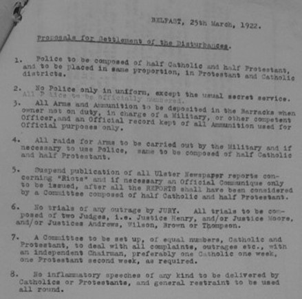 22 Proposals for settlement of the disturbances, 25 March 1922, PRONI, CAB/6/37 Disturbances in Belfast, CAB/6/37.