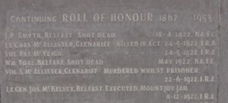 Smith was 14 years old and lived in Mayfair Street; evidence at his inquest indicated that he was shot in the head while standing at his front door, the shot being fired from the direction of Ballynure Street on the opposite side of the Oldpark Road. Although no Military Service Pensions file for him has yet been released, he was almost certainly a member of Na Fianna – the Roll of Honour on the republican County Antrim Memorial in Milltown Cemetery notes that J.P. Smyth of the Belfast Fianna was shot dead on 18 April 1922.30